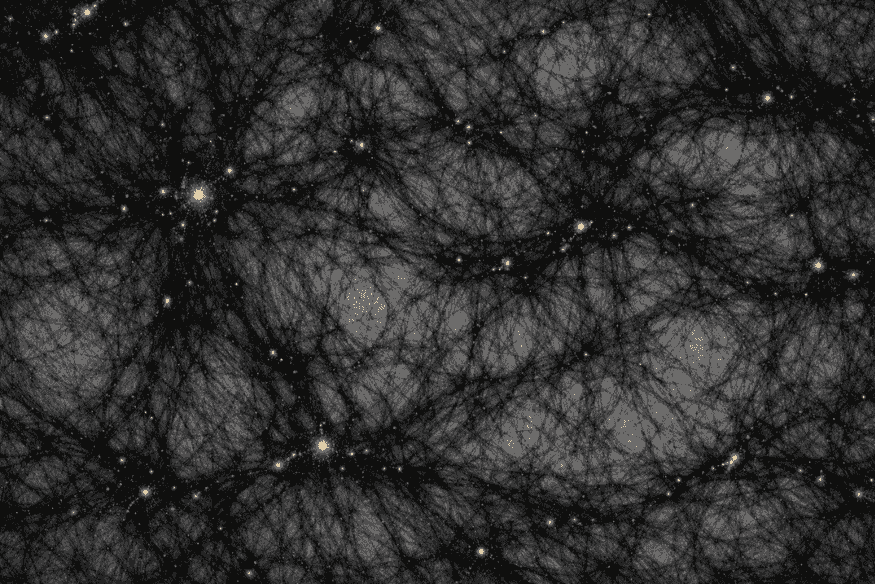 Em modelos, a matéria escura começa a se acumular em filamentos. O gás cai nesses filamentos e, nos pontos de encontro, forma regiões ainda mais densas. Esses nós são locais onde surgem aglomerados de galáxias.